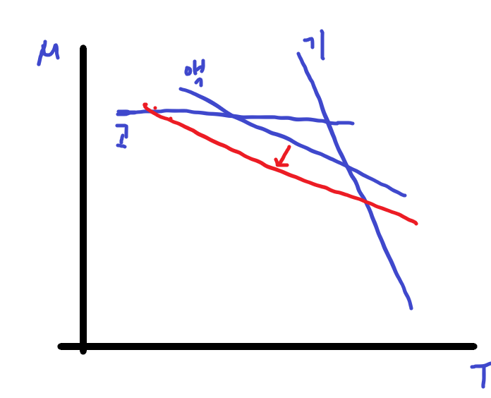 gibbs에너지 대 온도에 대한 화학 potential은 계의 상태가 고상,액상,기상에 따라 gibbs에너지의 변화량이 다릅니다. 계에 외래 성분이 들어오는경우, 순수상인 액상은 용질을 포함하여 용액이 되고, 고상이나 기상은 용질을 포함하지 않는다면, 용액의 화학 potential은 다음와 같이 이동합니다. (\(\mu_i = \mu_i^0 + RTlnx_i\) 에서 단성분인 순수 물질 (\(x_i\) = 1)에 외래성분을 첨가하면 \(x_i\)값은 1보다 작아지므로 화학퍼텐셜이 감소) (\(x_i\)는 i성분의 몰분율)