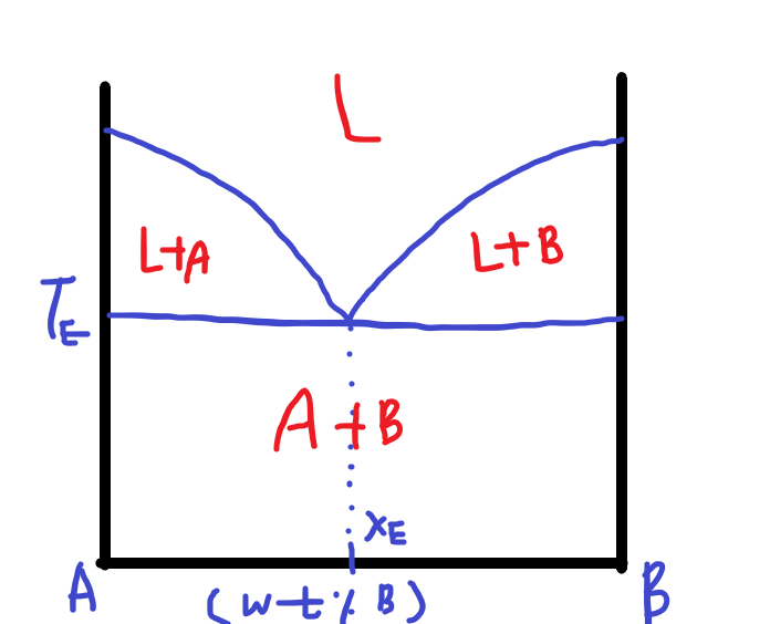 다음과 같이 (A,B는 고체상) 형태가 나오는데, 용질원자를 추가함에 따라 용융점이 낮아지며 두 낮아진
