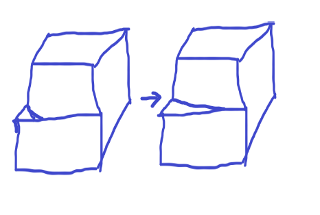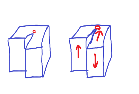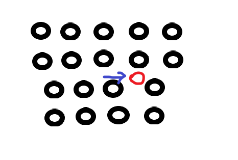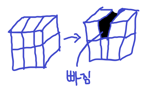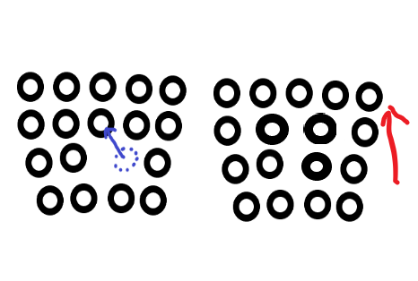 위의 그림과 같이 원자로 이루어진 격자가 있었다고 했을때 격자의 면중 한 면이 빠진 왼쪽의 격자에서 오른쪽과 같이 한 부분이 빠졌다고 생각해보겠습니다. (위의 그림은 굉장히 굵게 그렸지만, 빠졌다고 해서 저렇게 큰 구멍이 생기는 정도는 아님, 원자 한개 얇기의 면이 빠진 모습)