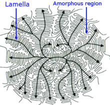 반결정성 고분자는 무작위로 배열되어 있는 분자로 이루어진 무정형의 매트릭스에 박혀 있는 결정성 부분으로 구성 되어 있다. 이때 박혀 있는 모양이 판상 고분자 결정에서 사슬 접힌 결정(라멜라) 로 보이게 되는데