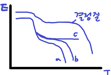 위와 같이 온도가 증가함에 따라 탄성계수가 감소하는데, 결정질의 경우 탄성계수가 어느정도는 유지됩니다. a의 경우 선형으로, 가장크게 급격히 감소, b는 branched, c는 cross-linked로 복잡하게 연결되 있을수록 유지되는 정도가 높아집니다.