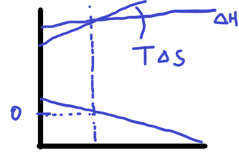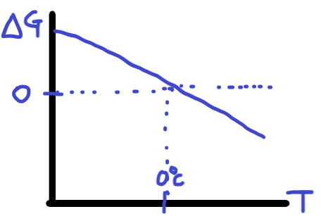 \(\Delta G=\Delta H -T\Delta S\)가 됩니다. (얼음->물 로의 상전이라고 생각)