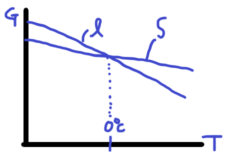 \(\Delta G=G_l-G_s\)입니다. 따라서 0도 이하에서는 +값을 가지고, 0도 이상에서는 -값을 가집니다.