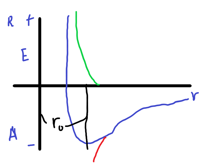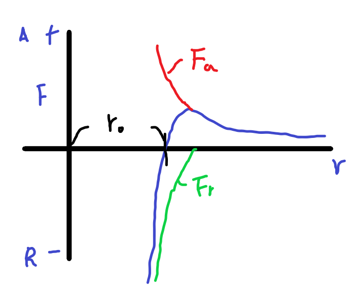 알짜힘은 거리가 가까워지며 척력이 커지는 정도가 훨씬 크므로 \(r_0\)때 0을 지난이후로 척력쪽으로 굉장히 커지게 된다.